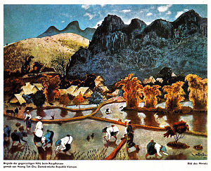 Brigade der gegenseitigen Hilfe beim Reispflanzen