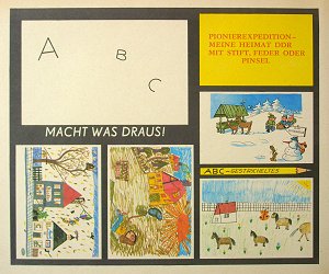 - Kartonblatt, 28*23 cm; Vorderseite: Zeichnungsvorlage und Kinderzeichnungen; Rückseite: Fotostrecke mit Horst Alisch als Zeichner bei einem Pioniermachmittag